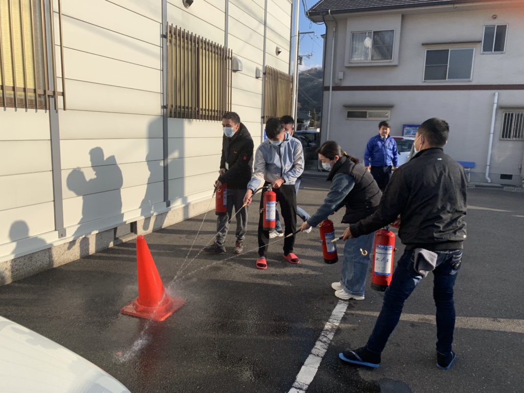 消火器を使用した消火訓練や119番通報の手順等を指導。